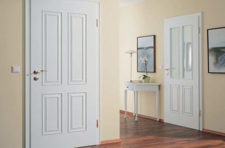 Простые двери подойдут для неоклассики и ультрасовременных направлений. Лаконичные прямые полотна с базовыми филенками часто используются при оформлении скандинавского интерьера. Здесь белый цвет доминирующий. То же самое можно сказать и о средиземноморском дизайне.