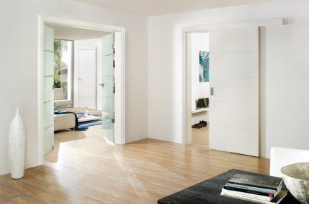 Модерн приемлет практически любые варианты белых полотен: как гладкие глухие, так и филенчатые. Сюда же стоит отнести арт-деко и фьюжн. Модели с глянцевой поверхностью впишутся в стиль хай-тек, особенно если дополнить дверь подходящей фурнитурой.