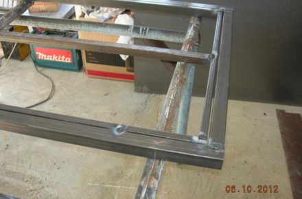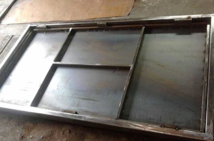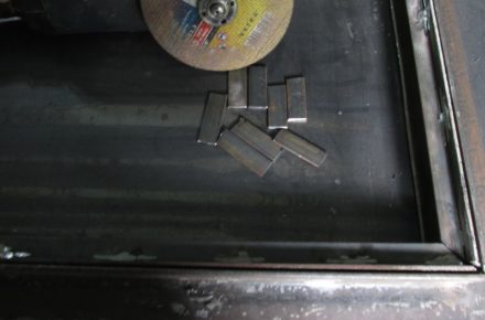 Затем делаем каркас. Уголки нарезаются на заданные длины. Края нужно отпилить таким образом, чтобы их было удобно сварить между собой. Ребра жесткости лучше нарезать уже после того, как полотно будет соединено с каркасом, чтобы подбить размеры с точностью до миллиметра.