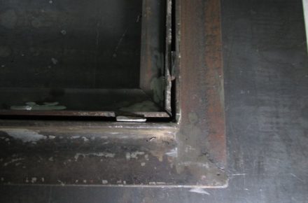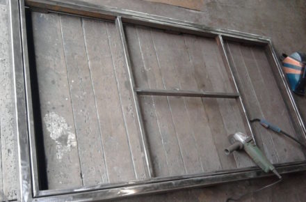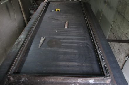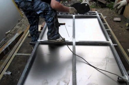 Затем к каркасу приваривается полотно двери — подготовленный лист железа. Предварительно нужно зачистить поверхности с помощью шлифовальной насадки на болгарку.
