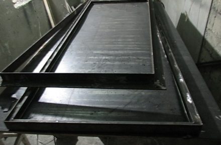 Полотно вырезается из нержавеющей стали. Лучше всего использовать цельный лист железа, так как наличие дополнительных швов на поверхности дверей не только исказит их внешний вид, но и отразится на прочности.