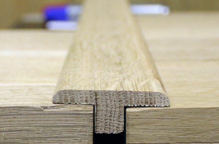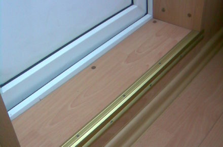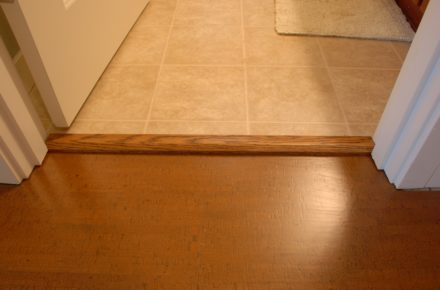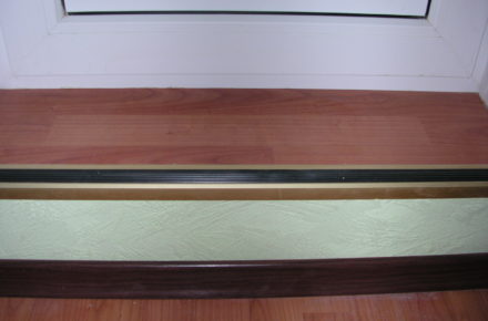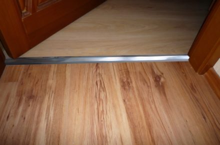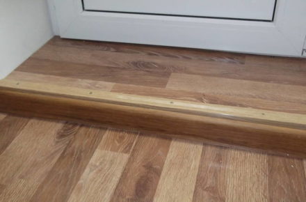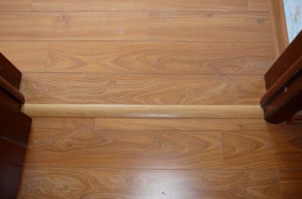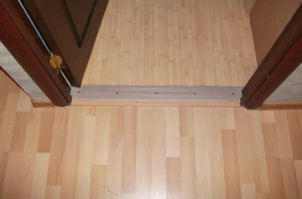 Более простой является установка невысокого порога межкомнатной двери. Это обычная пластина-накладка для разграничения напольного покрытия. Её можно зафиксировать клеем или закрутить на саморезы.
