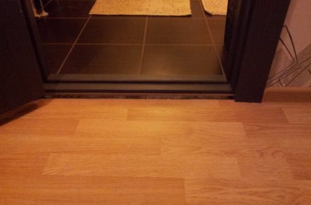 В гостиной, кухне и жилых помещениях часто устанавливают двери с коробом без порога. Можно установить межкомнатный порожек. Высота элемента должна вписаться в оставшийся после монтажа зазор между полотном и полом.
